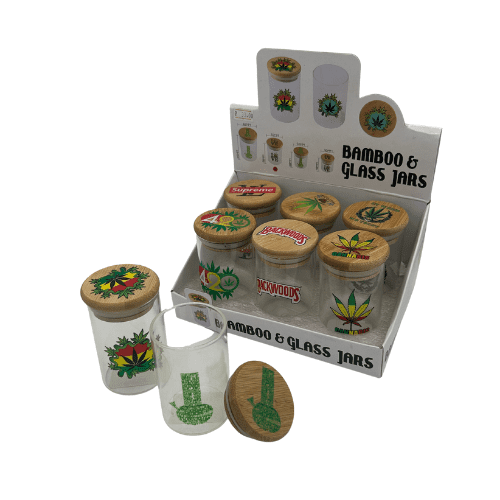 צנצנת וואקום מזכוכית עם מכסה עץ במגוון ציורים מגניבים